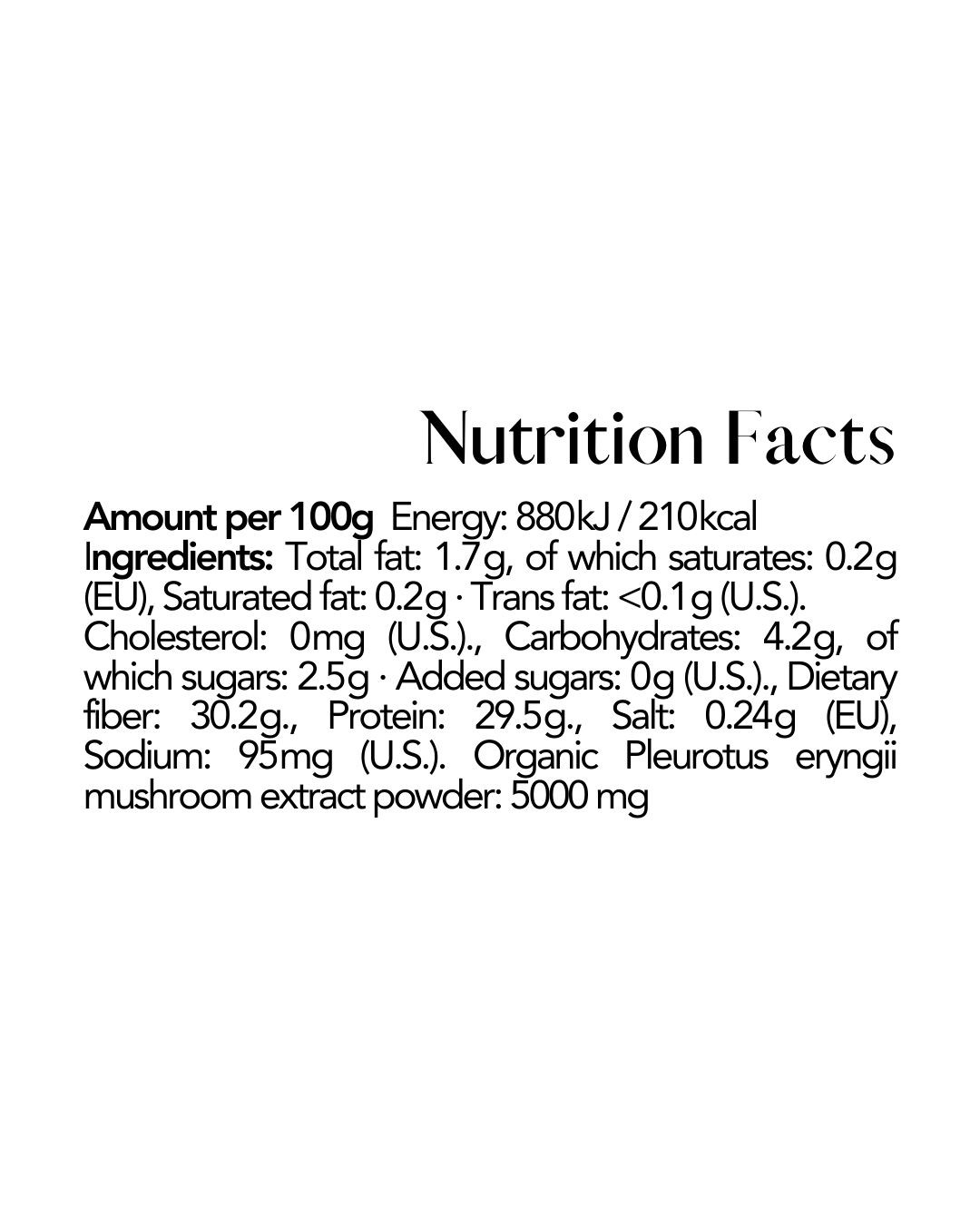 Wellbeing, re‑imagined through the language of taste. Crafted with our own‑grown Pleurotus eryngii, dual‑extracted and freeze-dried to preserve its full spectrum of natural bioactive compounds.