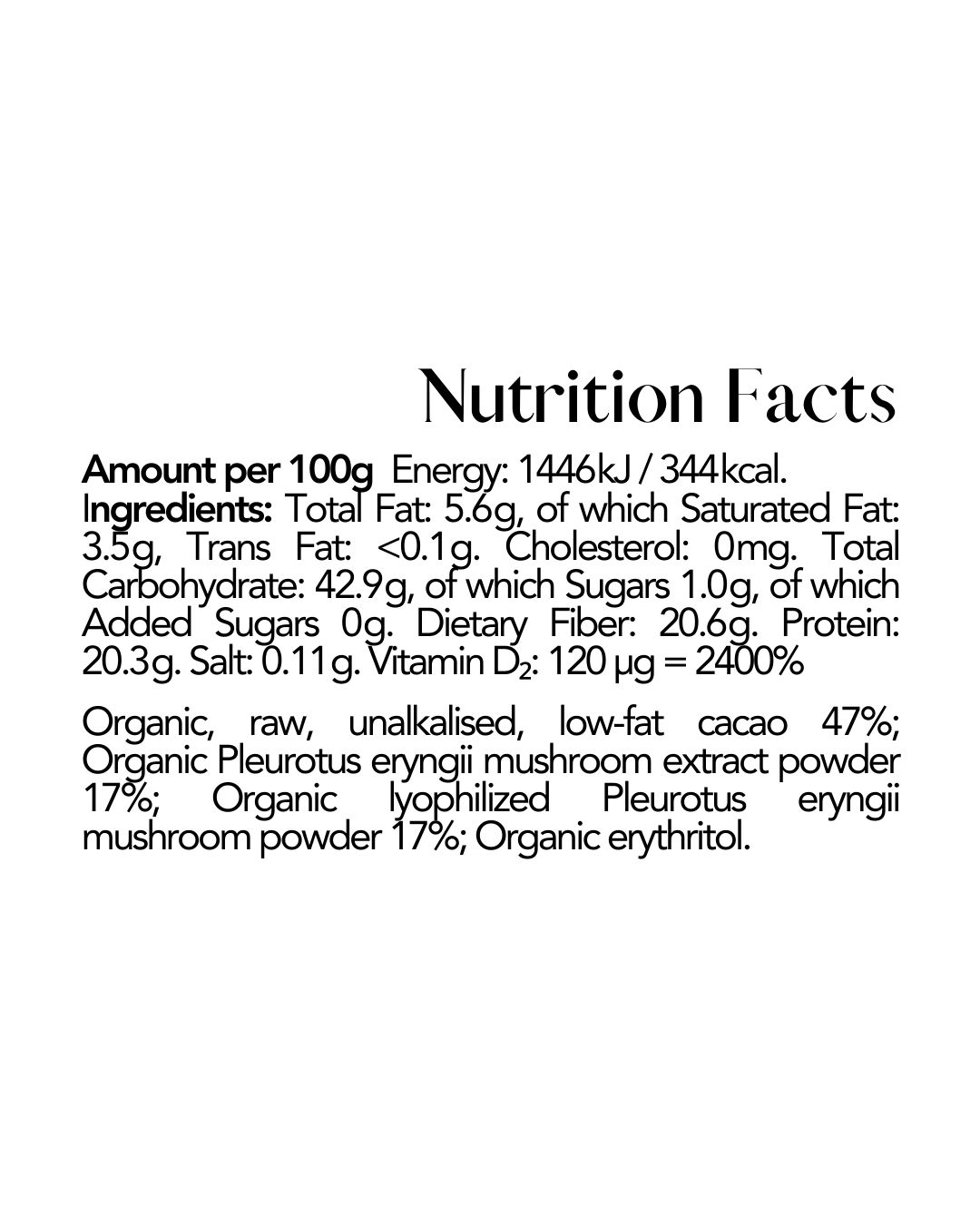 • MUSCLE & BONE HEALTH. High in mushroom protein and vitamin D2, which contributes to the maintenance of muscle mass and normal bones—particularly supportive for active lifestyles and women’s wellbeing.